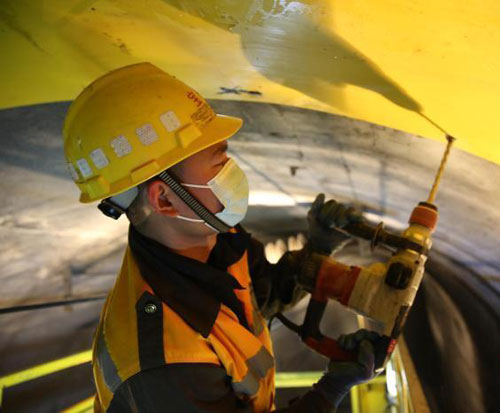 图为“堵漏人”在隧道内作业
